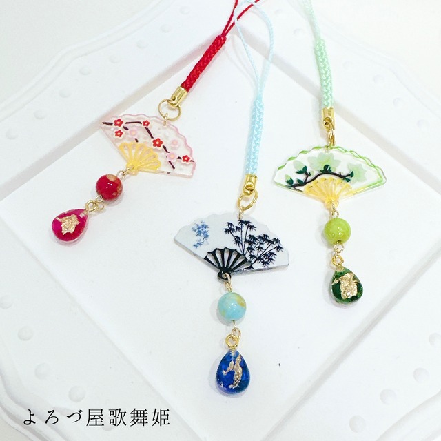 舞扇をモチーフにした根付けです。 カラー:柘榴(赤).瑠璃(青).柚葉(緑) ※天然石はカラージェイドを使用しております。 ※レジン使用作品 ※発送は1月5日から順次おこないます。