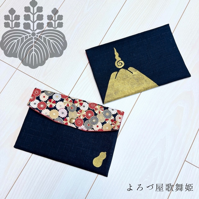 豊臣兄弟を記念して、豊臣秀吉の富士御神火文 黒黄羅紗陣羽織をイメージした御朱印帳いれです。 サイズ:14センチ×22センチ (13センチ×19.5センチ、厚み1.5センチ程度の御朱印帳まで収容可能。写真の御朱印帳は12センチ×18センチ、厚み1.5センチです。こちらのサイズでしたら厚み2センチ程度まで余裕で入ります)